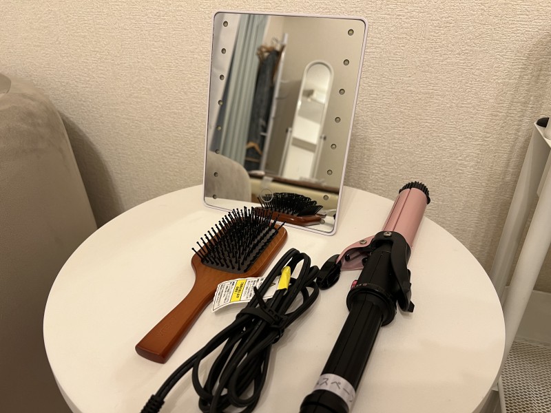 ソファ/サイドテーブル/キッチン/全身鏡/ハンガーラック/ハンガー/空気清浄機兼加湿器/靴ベラ/電子ケトル/掃除機/ネイル施術用台(メイク直し台としても使えます)/間接照明/Bluetoothスピーカー