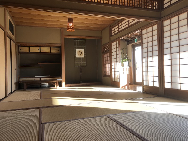 湘南・茅ヶ崎にある古民家貸別荘で、2階の貸スペースの広い窓からは日本庭園が眺められます。リノベーションされた館内は古き良き木造の雰囲気とモダンデザインが融合されており、1階にはカフェが併設しています。