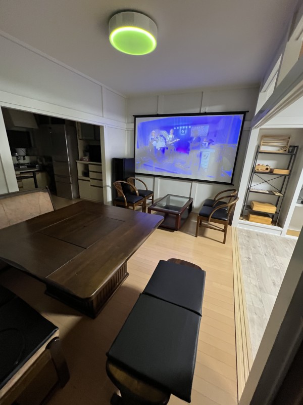 100インチプロジェクター完備。映画会、推し活鑑賞会、誕生日会、交流会、合コン、勉強会など、多目的にご利用いただけます。飲食の持ち込みも可能です。